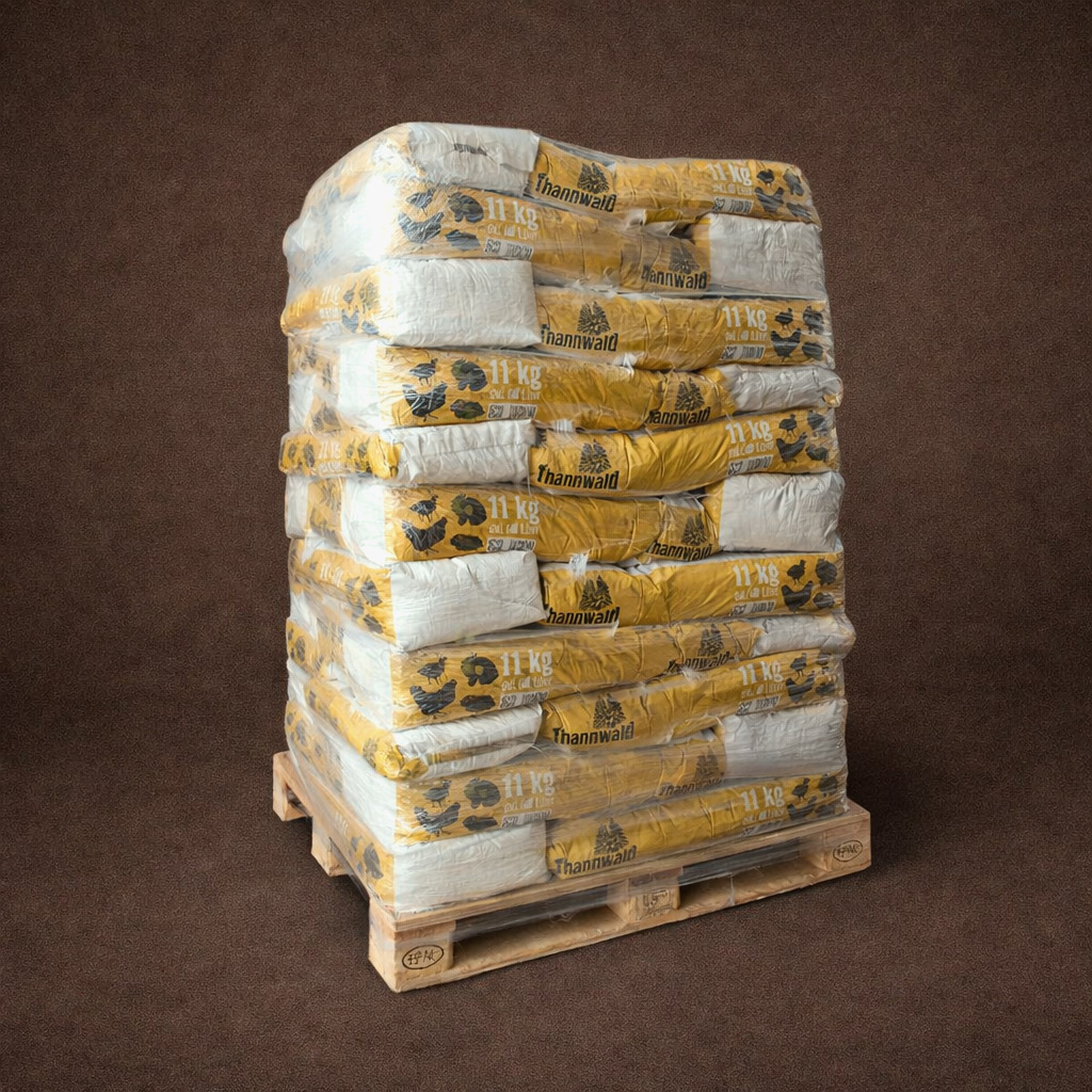 Eine Palette besteht aus 33 Säcken, wobei jeder Sack ca. 11 kg wiegt und etwa 60 Liter Einstreu enthält. Das Gesamtgewicht einer Palette beträgt somit ca. 363 kg und das Gesamtvolumen ca. 2.000 Liter.